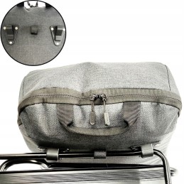 Bardzo łatwy, szybki i niewymagający narzędzi system montażu - 2 zaczepy plastikowe o bagażnik oraz 2 paski z rzepami.